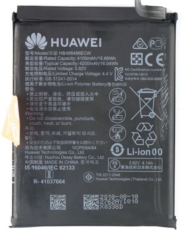 华为Mate20 Pro的电池由ATL代工,额定容量4100mAh,典型容量4200mAh,额定电压3.82V,充电限制为4.4V。