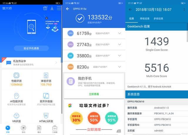 从安兔兔跑分测试来看,OPPO R15X跑分在13.3万+,性能表现中端主流。可以高帧模式流畅《王者荣耀》,对于偏大型的《绝地求生 刺激战场》类吃鸡游戏,也能够较为流畅的运行,性能可以满足大多数主流用户当下需求。