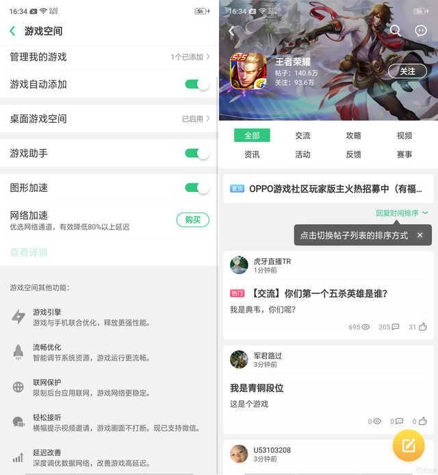 针对游戏用户,ColorOS 5.2也做了不少优化,在“性能模式”、“免打扰”、“亮度锁定”的基础上新增“禁用副卡”,“游戏助手”还新增了游戏挂机、截屏、录屏功能。此外,Hyper Boost加速,对系统流畅度和游戏体验都有较为明显的提升。