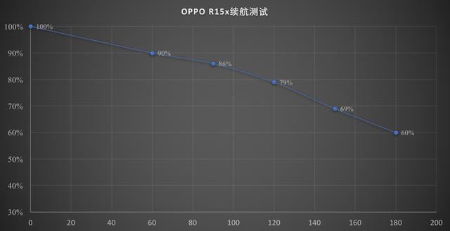 续航方面,OPPO R15X内置3600mAh电池,通过三小时重度使用测试后,剩余电量在60%左右,如下图所示。