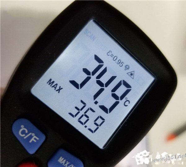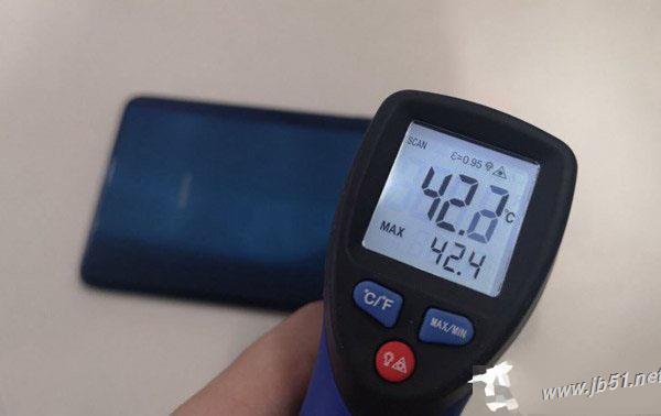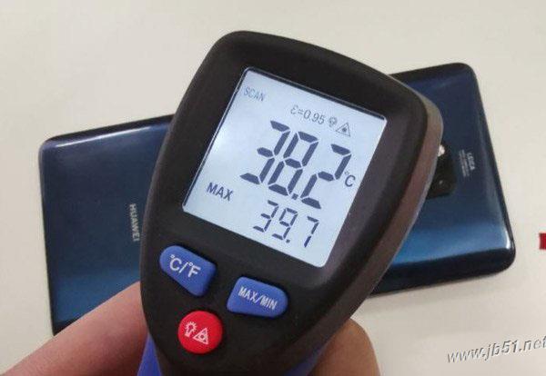 不过有趣的是,在温度计刚测机身温度的前几秒钟,温度达到了40°C左右,但随后的几秒钟,温度下降,不断移动温度计角度,最终测得最高温度为39.7°C。