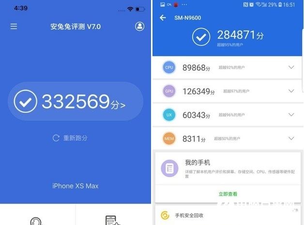 iPhone XS和三星Note9安兔兔跑分对比