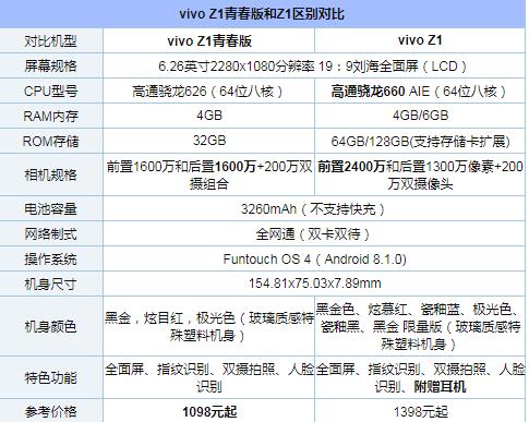 新上市的vivo Z1青春版则只有一个版本,区别如下:
