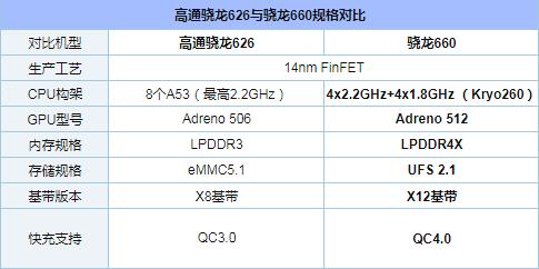 除了工艺制程,骁龙660 AIE相比骁龙626有全面的提升。从安兔兔跑分来看,骁龙626手机跑分仅8万分左右,而骁龙660 AIE手机跑分普遍在14万左右,两者性能相差悬殊。就当今来说,骁龙626已经属于入门处理器范畴,而骁龙660则属于中端主流处理器,差距还是很明显的。