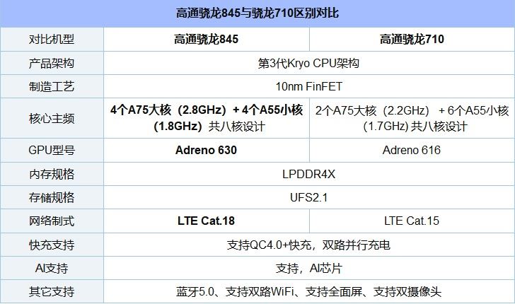 | CPU型号 | 高通骁龙845(64位八核) | 高通骁龙710(10nm制程 64位八核) |
