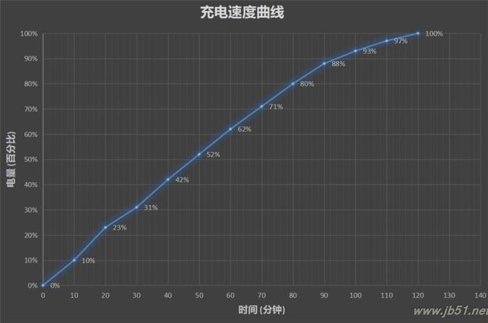 充电测试从0开始,每10分钟纪录一次电量,直至充满。充电过程中保持息屏状态,关闭WiFi,清空后台应用。由下图可见其用时120分钟,作为一部大电池千元手机,这个充电速度符合小编预期。