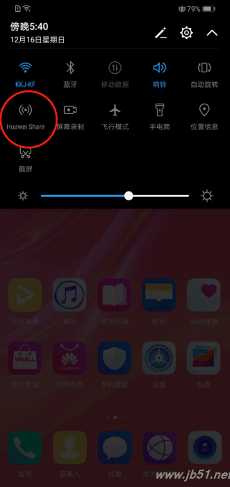 如上图所示。打开手机,从状态栏处向下滑动,打开通知面板。然后长摁Huawei Share的icon,进入Huawei Share2.0设置界面,打开Huawei Share,打开共享至电脑,按照如下流程即可完成操作。