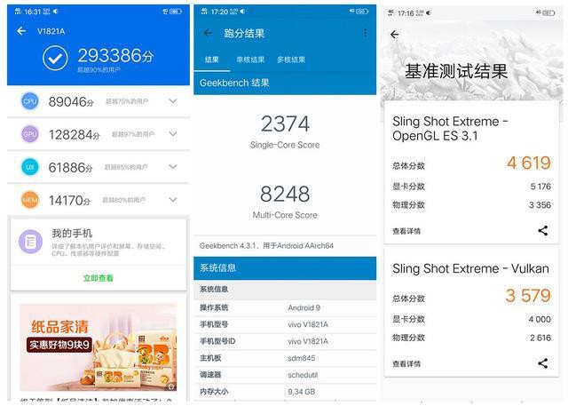 从安兔兔跑分测试来看,vivo NEX双屏版跑分达到了29.3万分,属于目前骁龙845旗舰机中跑分比较高的水准,性能无疑是定位高端。此外,Geekbench跑分,这款手机也跑分比较高的单核和多核水准。