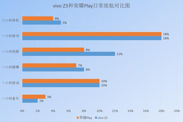续航方面,荣耀Play内置电池容量比vivo Z3大了400mAh以上,而vivo Z3则快充充电器规格略高一些,续航上其实也是各有千秋,下面具体看一组续航测试数据。
