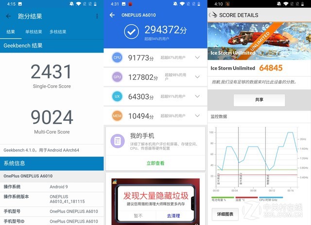 可以看到,Geekbench的多核跑分甚至达到了9024分,安兔兔也达到了294372分,对游戏性能有最清晰体现的3DMark测试也达到了64845分,整体性能十分强劲。