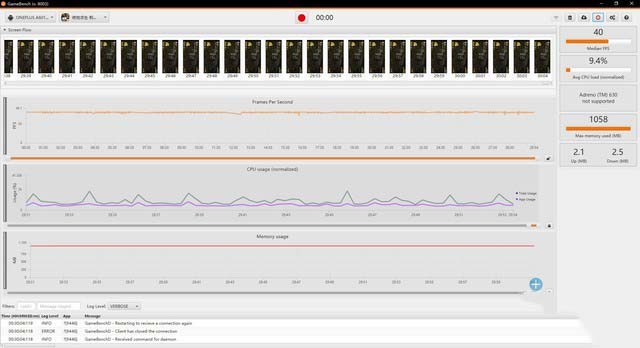 可以看到是,30分钟的刺激战场中,帧率一直非常稳定,稳定在40帧满帧水平。并没有出现明显的掉帧,这充分体现了一加6T超强的性能水平。