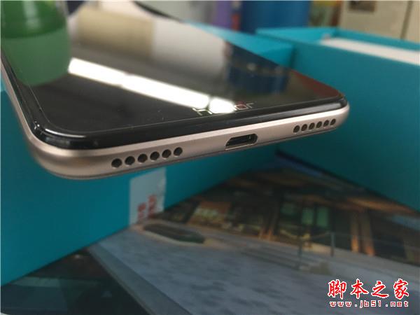 机身底端有扬声器、Micro USB充电接口,我们可以看到扬声器有两部分,说明荣耀8A的音质不会差,声音音质、响度比上一代7A提升了30%。