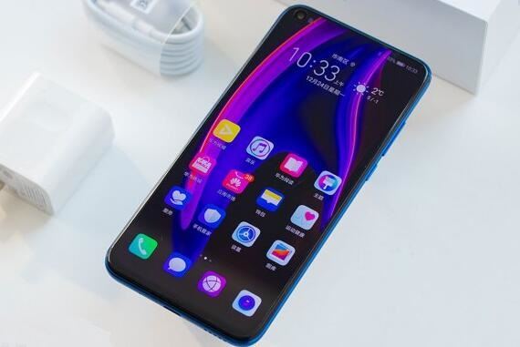 荣耀V20正面为一块6.4英寸LCD屏幕的魅眼全视屏设计,分辨率为2310X1080像素,正面左上角有一个2500万像素自拍摄像头,听筒、指示灯、距离和光线传感器则全部隐藏,荣耀V20背部有特殊的V型纳米隐形极光纹理,材质为玻璃材质。如下图所示: