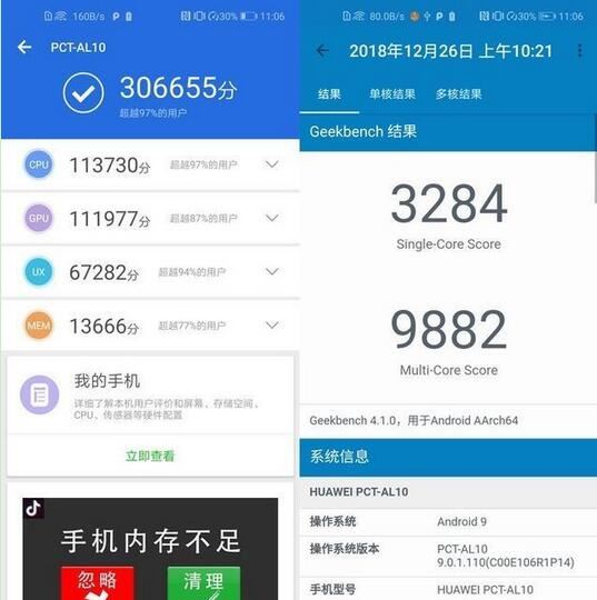 核心配置方面,荣耀V20采用华为最新的麒麟980处理器,支持GPU Turbo2.0技术,搭配6/8GB+128GB存储组合,运行时下大型游戏都不在话下。如下图为荣耀V20跑分成绩: