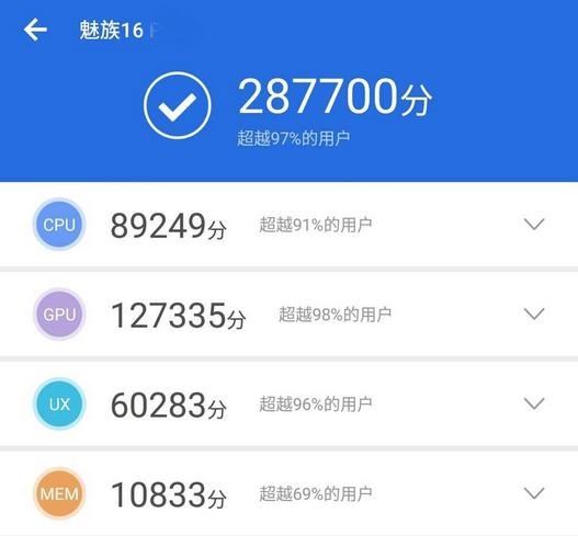 而魅族16搭载的是目前最强的移动处理器-高通骁龙845处理器,并配备了6/8GB RAM+128/256GB ROM的组合存储,在跑分方面,接近29万分的成绩,如下图为魅族16跑分成绩: