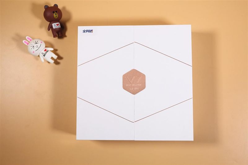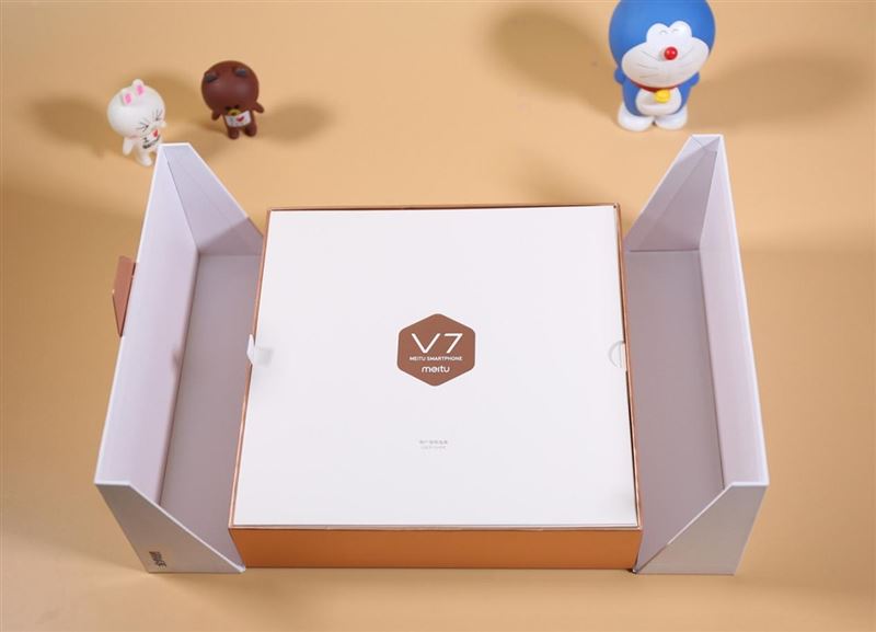 这是美图V7的包装盒外观情况,其中间V字名牌微微凸起,整面都简洁干练。