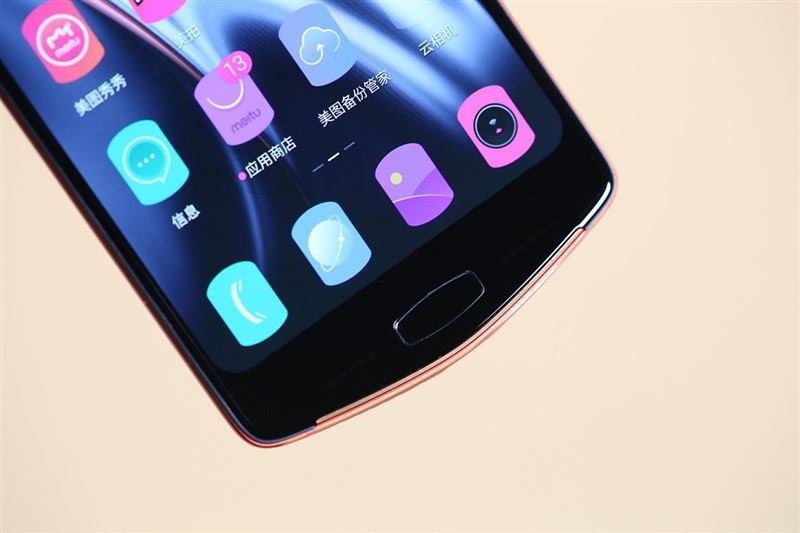 和前代一样,其下巴为了和额头刘海保持对称美观,美图V7依旧在下巴上安放了正面指纹模块,不过稍有不同的是,其形状依旧由最早的圆形过渡为长方形,支持MTengine触感引擎,可根据情景提供不同震感反馈。