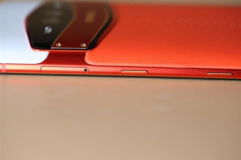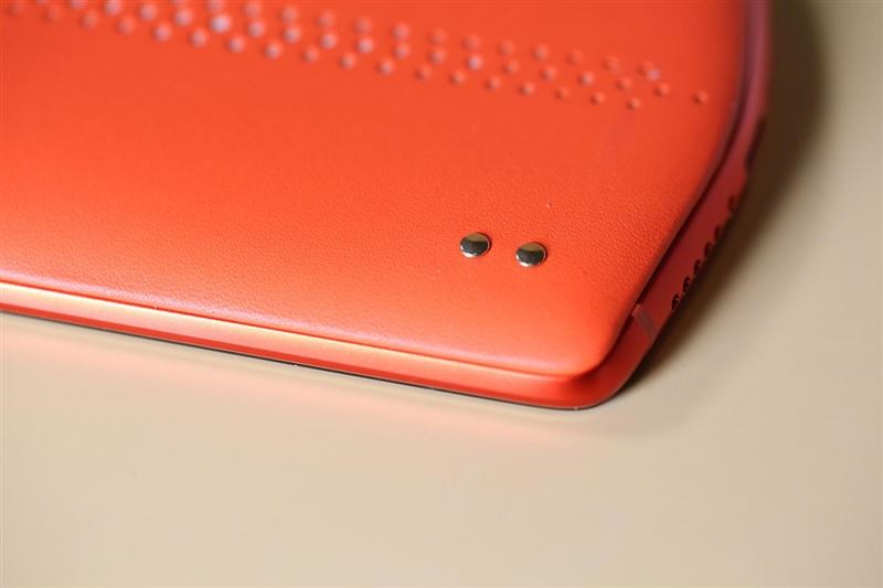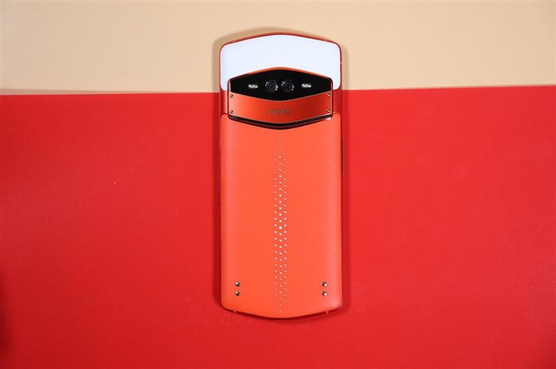这是美图V7的背部,整体为橙色与白色的搭配,下部覆盖了官方所称的意大利高定头层白色小牛皮。手感确实是非常细腻温和,不过经过笔者多日使用之后发现其在日常当中要注意呵护保养。