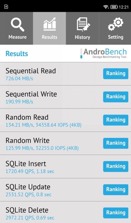 Androbench顺序读取成绩726.04MB/s,也是其首次用上UFS 2.1高速闪存。