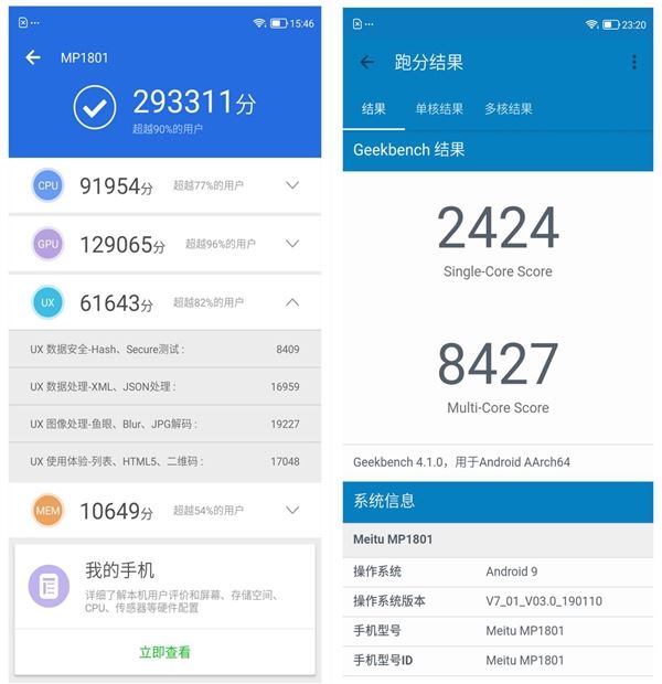 跑分方面,美图V7的安兔兔测试成绩超过到了29万分,Geekbench单核心2424分,多核心8427分。这个成绩与笔者之前所测试过的一众845旗舰机型大致相当。