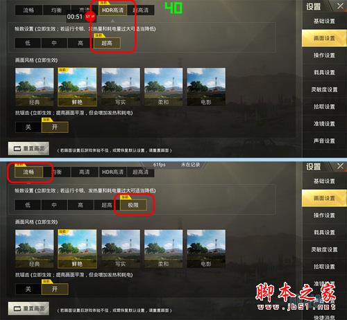 我们使用刺激战场进行测试,不过这次为了充分考量骁龙855,采用了HDR高清+超高帧率(锁帧40fps)与流畅+极限帧率(锁帧60fps)两组设置来进行测试,当然,抗锯齿都保持开启,流畅自适应关闭,两次测试分别使用Gamebench和快否进行全程监测。