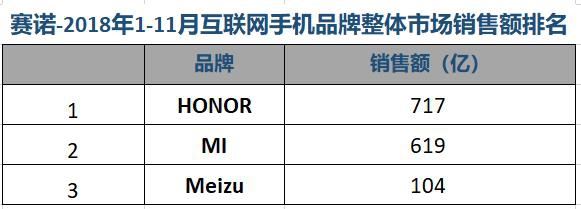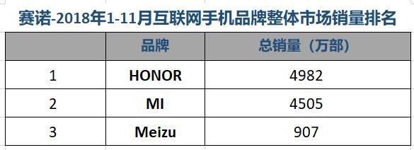 据赛诺数据显示,在过去的2018年1-11月,荣耀4982万部的销量、717亿元的销售额接近小米和魅族的总和,牢牢稳坐在互联网手机品牌的头把交椅。