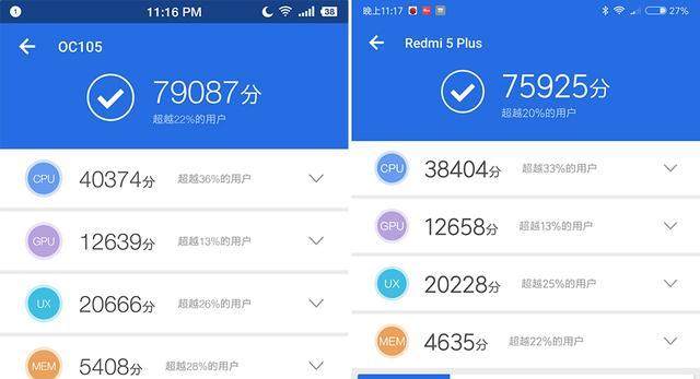 安兔兔跑分方面,坚果3跑分稍高,为79087分,而红米5P低一些,为75925分,基本是同一档次的。