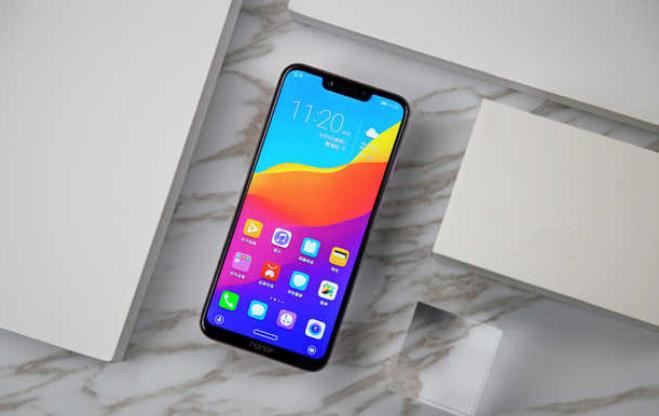 而荣耀Play正面采用了6.3英寸大视野全面屏,分辨率为2340x1080像素,其屏幕比例为19.5:9,屏占比高达89%,顶部采用与荣耀10“小萌脸”相似的“刘海”设计,“下巴”则收窄为6.5mm,屏幕视野更广,冲击力强。边框四周的黑边宽度也恰到好处,屏幕到机身之间的过渡非常自然。屏幕正面没有任何按键,只有“下巴”部位有荣耀logo。如下图所示:
