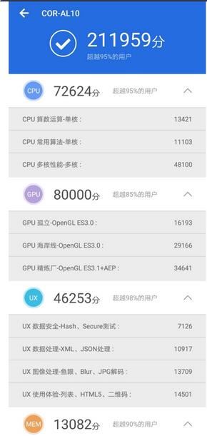 而核心硬件上,荣耀Play搭载的是华为自家的高端麒麟970处理器,提供4/6GB运存,众所周知,麒麟970处理器性能是非常不错的,如下图为荣耀Play跑分成绩: