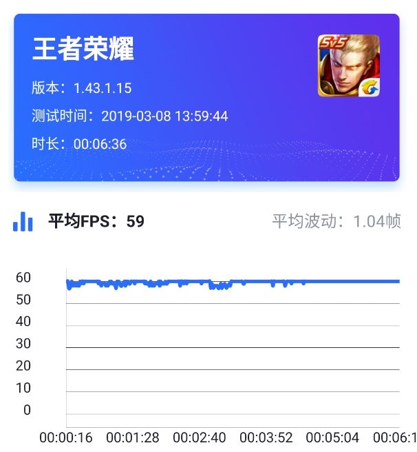 目前《王者荣耀》的高帧率模式最高支持60FPS,可以看到, KFMark测得《王者荣耀》游戏平均FPS为59帧,帧数的平均波动在1.04帧,魅族Note 9基本全程满帧。