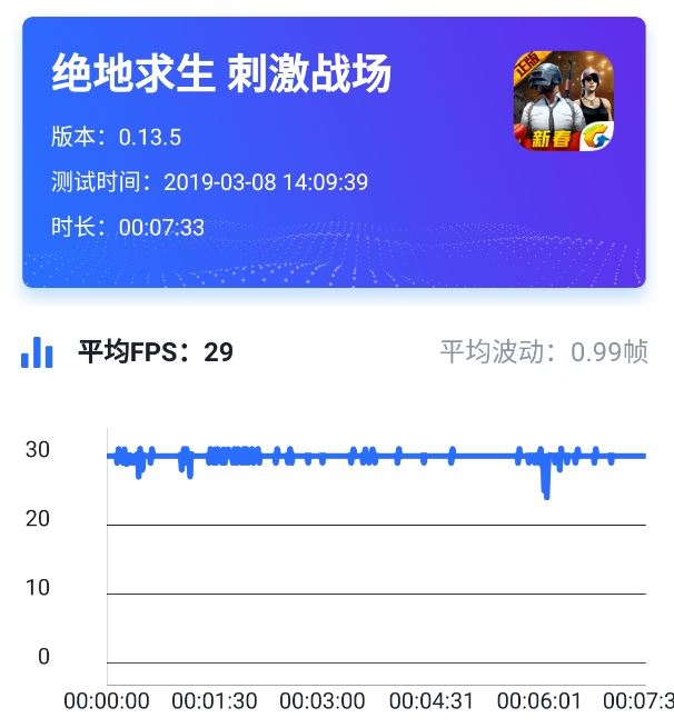 目前《刺激战场》的高帧数下最高只有30FPS,可以看到,在游戏时间内,KFMark测得《刺激战场》游戏平均FPS为29帧,帧数的平均波动在0.99帧。