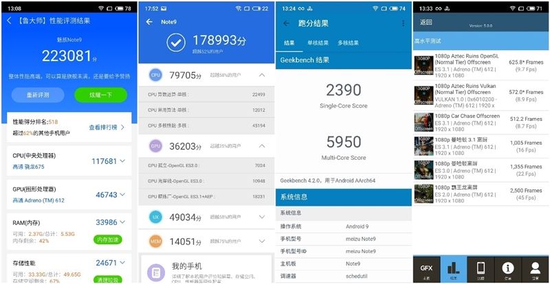 魅族Note 9在鲁大师上跑出了22万分的高分,在安兔兔上跑出了17.8接近18万的高分,虽然未超过18万,但相较于骁龙660的14左右的安兔兔跑分,已经提升了一个档次。