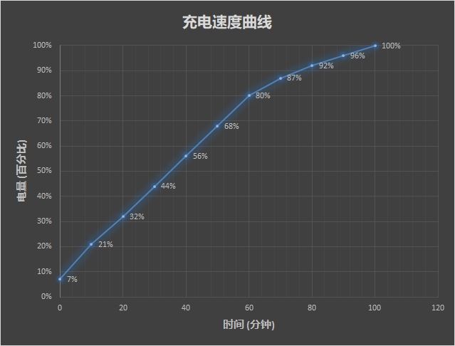 这里从7%开始开机息屏充电,40分钟冲入49%的电量,表现优异,最终耗时100分钟充满,超出千元机平均水准。