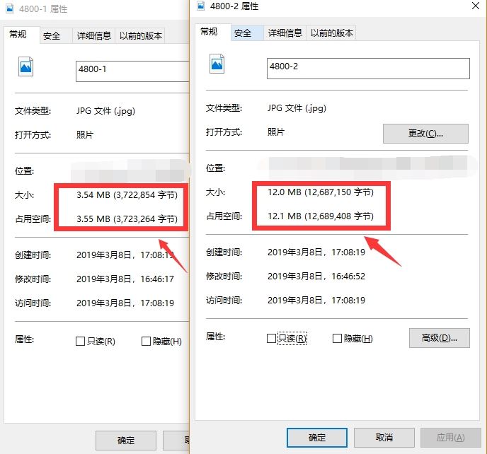 这是两张样张的文件体积,可以很直观地看到,4800万模式下样张大小要比默认模式下打上4倍左右,这多出的MB都是信息量啊。
