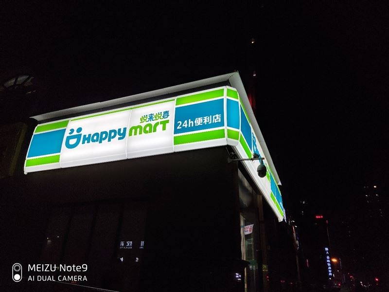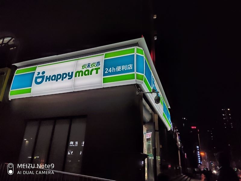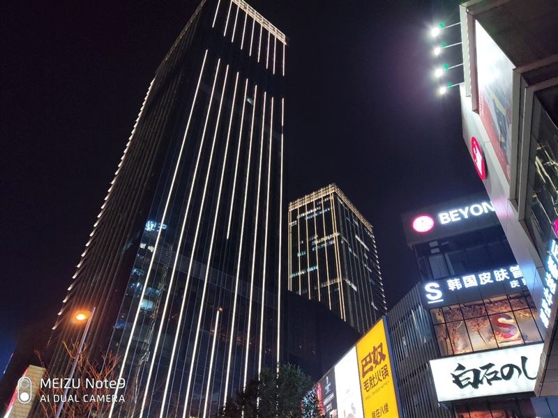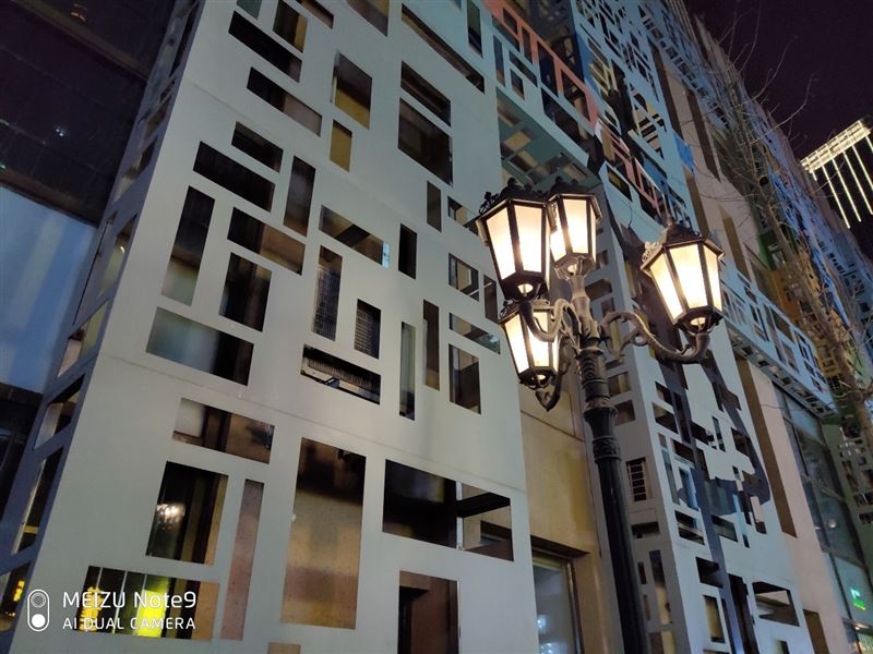 先说结论,魅族Note 9的夜间样张水准已经不太像一部千元机的水平,其夜景表现大大超出了笔者的意料,夜间样张的画面亮度在许多情况下已经超出了人眼的感光范围,直接表现就是夜景很亮,不过也因为这样的调教,导致出现夜景白平衡略有失真,部分场景下对比度不足的情况。