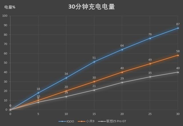可以看到采用11V-4A充电器,功率达到44W的iQOO充电速度大幅领先小米和联想。要知道,iQOO的电池容量同样远高于3300mAh的小米9,达到4000mAh电量。