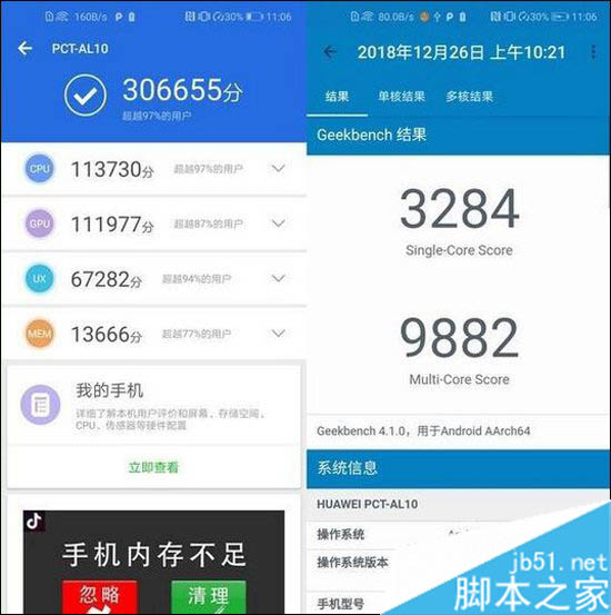 荣耀V20采用华为最新的麒麟980处理器,支持GPU Turbo2.0技术,搭配6/8GB+128GB存储组合,运行时下大型游戏都不在话下。如下图为荣耀V20跑分成绩: