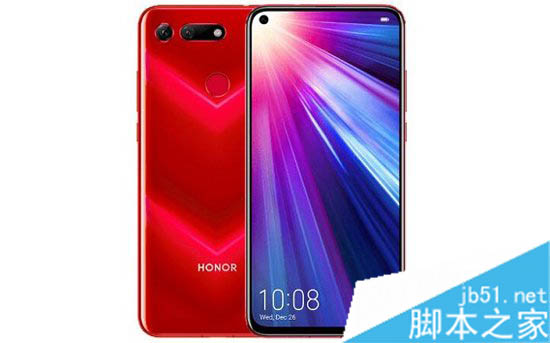 荣耀V20正面为一块6.4英寸LCD屏幕的魅眼全视屏设计,分辨率为2310X1080像素,正面左上角有一个2500万像素自拍摄像头,听筒、指示灯、距离和光线传感器则全部隐藏,荣耀V20背部有特殊的V型纳米隐形极光纹理,材质为玻璃材质。如下图所示: