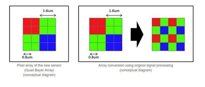 ↑“Quad Bayer”4像素同色滤色器,弱光下可实现四合一像素