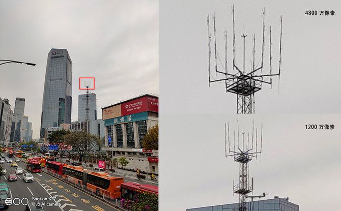 4800万像素模式主要在中远场景,或被拍物相对细小的场景。从同一位置拍摄的照片的可以看到,4800万像素照片中的信号塔可以进一步放大,同时更容易看清楚天线杆上的细节。