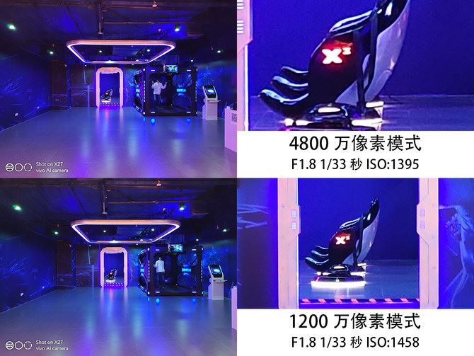 关于4800万像素弱光环境下的表现,我们挑了一个相当暗的体感游乐场测试。有点意外的是,同样的快门速度下4800万像素模式并没有爆ISO,整体上两个模式的照片明亮度也很接近,另外放大至100%也没有感觉到明显的噪点。