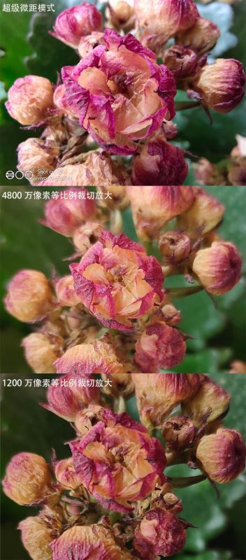 不过有小伙伴可能会问,我用4800万像素拍了再放大效果不是一样么?抱着这个问题我们拍了一组给大家作为对比。这里超级微距模式的是原图,然后4800万和1200万按前者的图像大小进行裁切,再将像素拉伸至前者的大小。实际上裁切后4800万约剩下600万像素,1200万约剩下150万像素。而超级微距模式则是默认的1300万像素,即使不放大也可以看清楚花瓣上的灰尘。