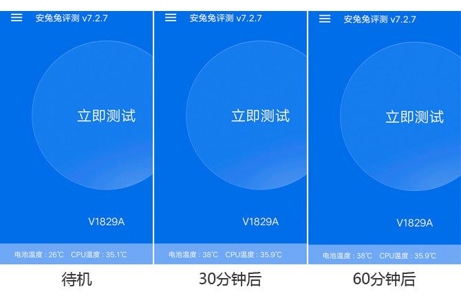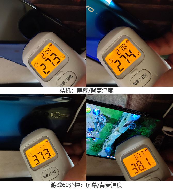 因为vivo X27内置了液冷热管,所以我们也很关注它的发热表现。在游戏的同时,我们分别记录了不同时刻的处理器、电池、背盖、屏幕温度(室温为22.5°)。
