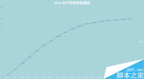 因为vivo表明了亮屏也能保持快充,那么咱们虽然不过分难为X27,但决定就不使用关机充电这样的最理想情况测试了,我们将电量耗尽,充至1%开机后开始开机充电并正式计时,5分钟整,X27回血至11%,10分钟充至22%,23分钟充至50%,初始效率不错,所以咱们可以更加关注中后期的充电曲线。
