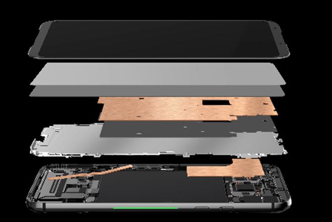 如果把黑鲨游戏手机2的内部分解,可以明显看到,黑鲨游戏手机2的散热不仅仅局限于我们常见的热管,而是采用热板+热管组合的全域散热设计。在屏幕与主板之间,采用超大面积的热板+热管(含液量提升5倍,散热面积提升5倍),覆盖全部发热部件,实现分区直触散热、独立热控。同时散出的热量也可依托金属中框快速、均匀地从机身后部排出,达到热源分散的设计,避免避免热源叠加。整个散热面积达到14555mm²,传热能力达到20W,使得CPU运行帧率运行时间提升700%。