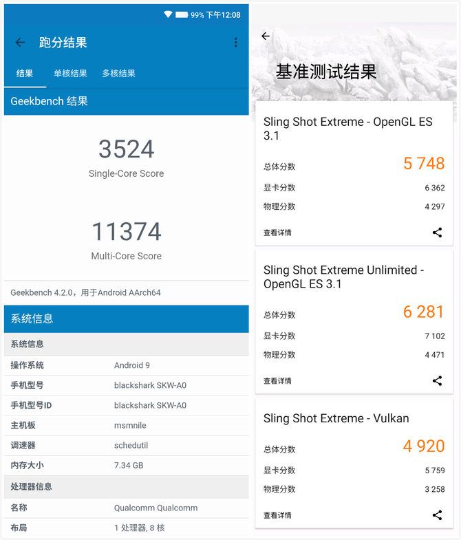 作为一款游戏手机,在硬件性能上自不必多说。黑鲨游戏手机2采用骁龙855移动平台。Geekbench4测试,单核3524分,多核11374分;3D Mark测试,OpenGL ES 3.1为5748分,Vulkan得分4920。在性能上毋庸置疑,处于目前安卓阵营的顶尖水准。