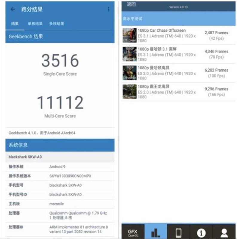 黑鲨游戏手机2目前在骁龙855机型阵营当中处于前列,这一点毫不意外,此前的黑鲨手机也是长期占据跑分榜单高位。另外的GFXBecnh与Geekbench跑分情况也是要超过笔者之前所评测过的IQOO等855机型。