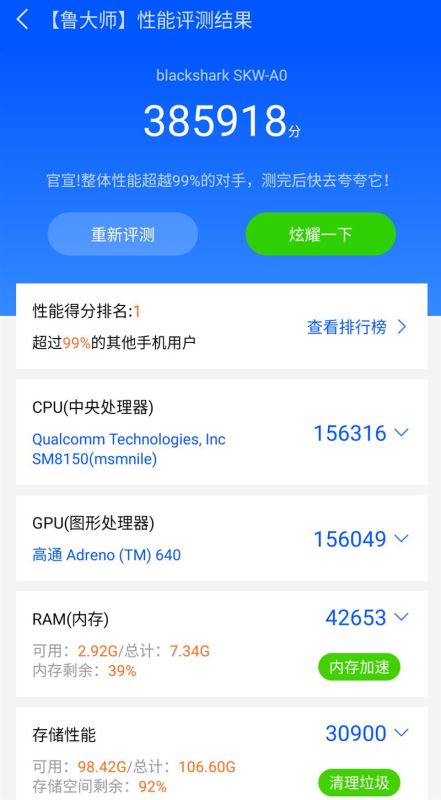 果不其然,黑鲨游戏手机2的鲁大师跑分成绩又一次居于高位。