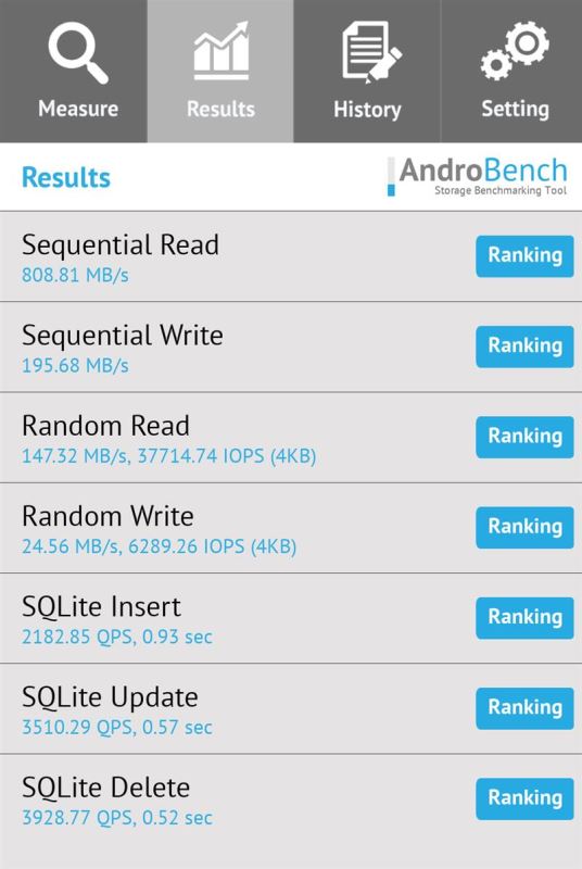 Androbench简介:AndroBench是一个基准测试应用,可以测量Android设备的4K随即存储·存储性能,包括内部或外部存储。