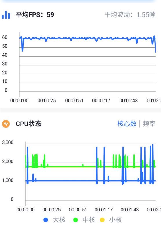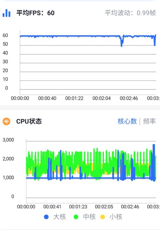 可以看到,黑鲨游戏手机2的表现非常稳定,画面帧数一直维持在60帧,0.99帧的波动几乎可以忽略不计。CPU频率方面可以看到这种对性能要求未到极限的游戏只需请出中核即可。